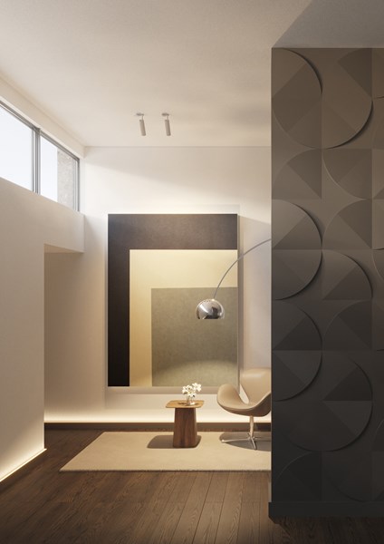 Das Wandpaneel Scuretto ist eine Anlehnung an Naturstein und seine mineralische Struktur. Mit seinen feinen Fugen bietet es eine fast unendliche Vielfalt an Kombinationsmöglichkeiten für ein ausgesprochen zeitgenössisches Ergebnis.