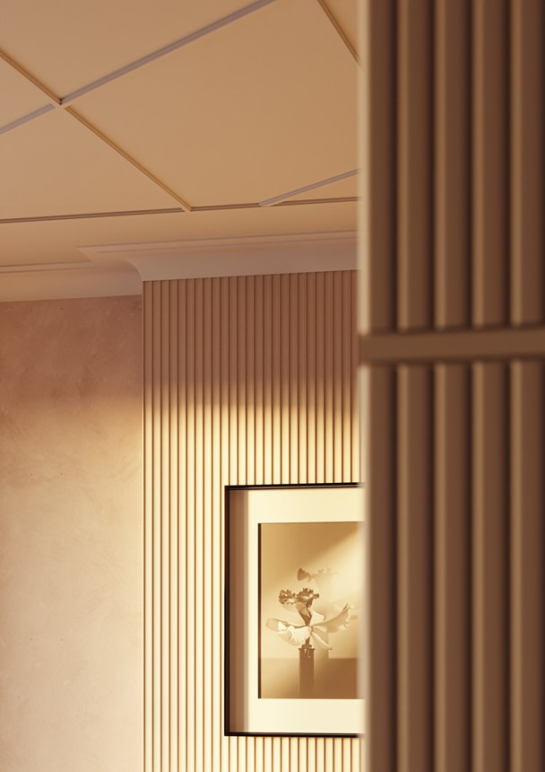 Mit direkter oder indirekter Beleuchtung kombinierbare Decken-, Wand- und Sockelleisten sowie Wanddekoraktionselemente.