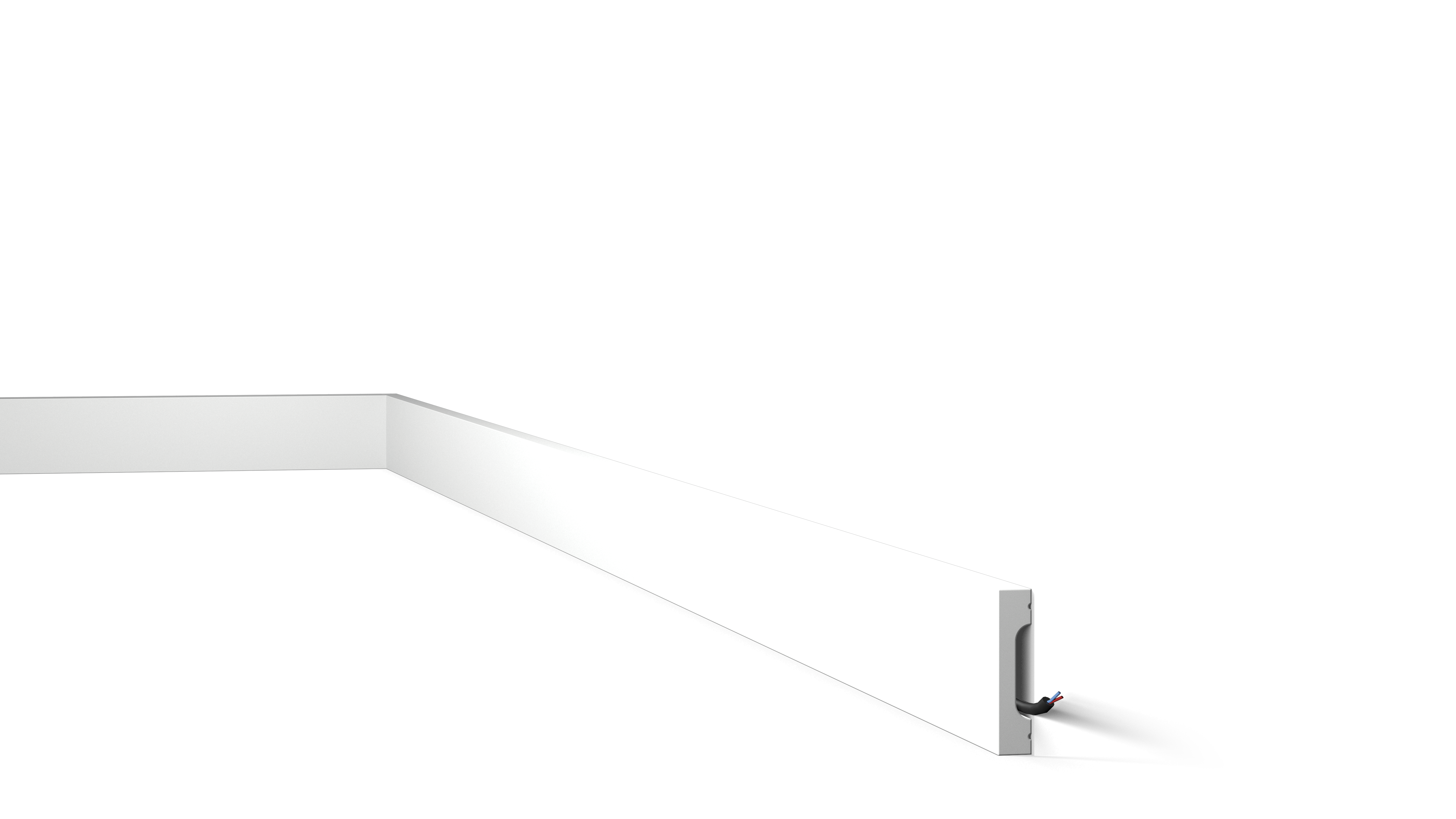 Mit direkter oder indirekter Beleuchtung kombinierbare Decken-, Wand- und Sockelleisten sowie Wanddekoraktionselemente.