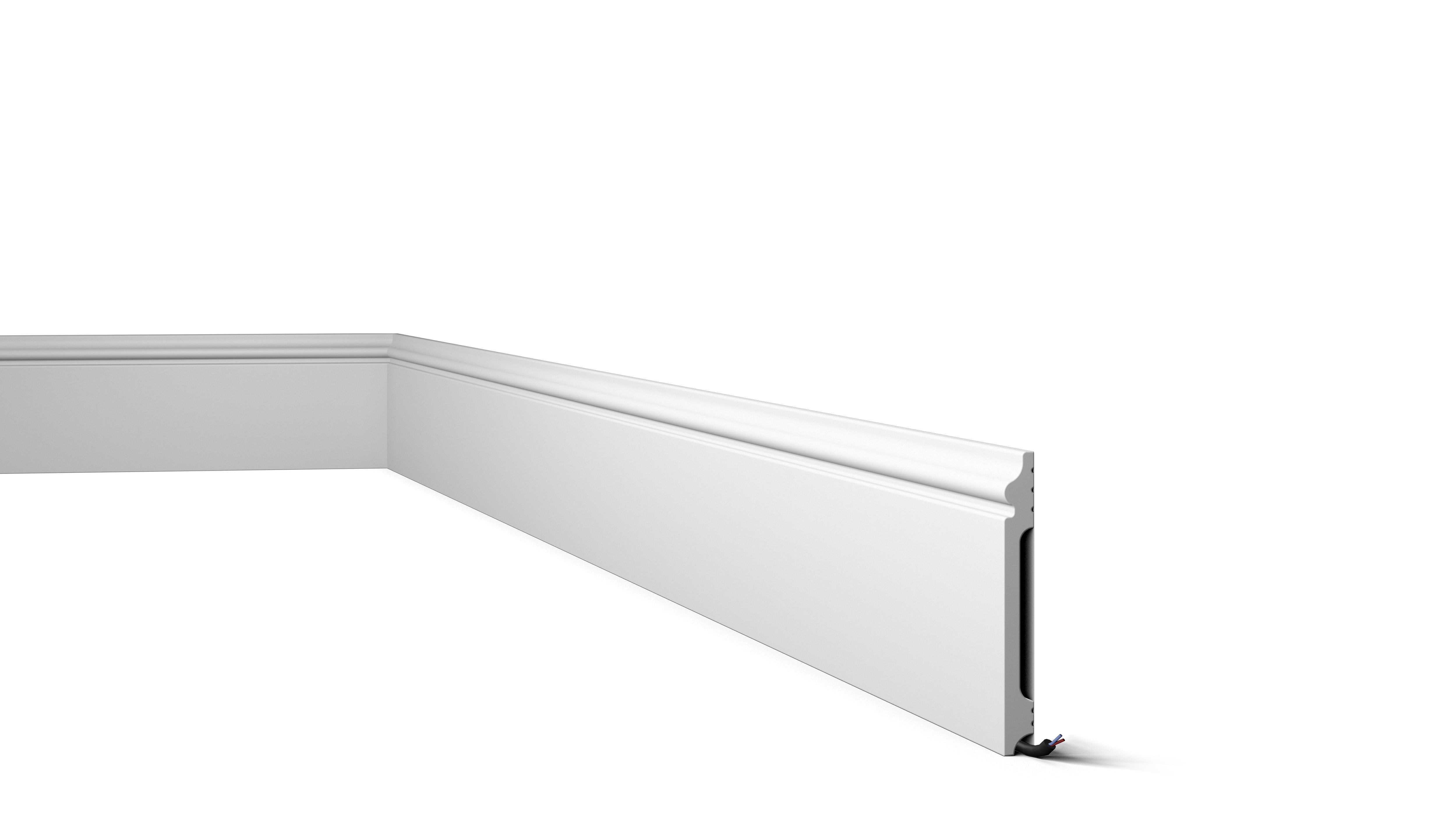 Mit direkter oder indirekter Beleuchtung kombinierbare Decken-, Wand- und Sockelleisten sowie Wanddekoraktionselemente.