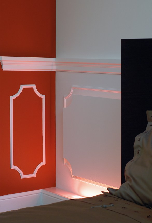 Mit direkter oder indirekter Beleuchtung kombinierbare Decken-, Wand- und Sockelleisten sowie Wanddekoraktionselemente.