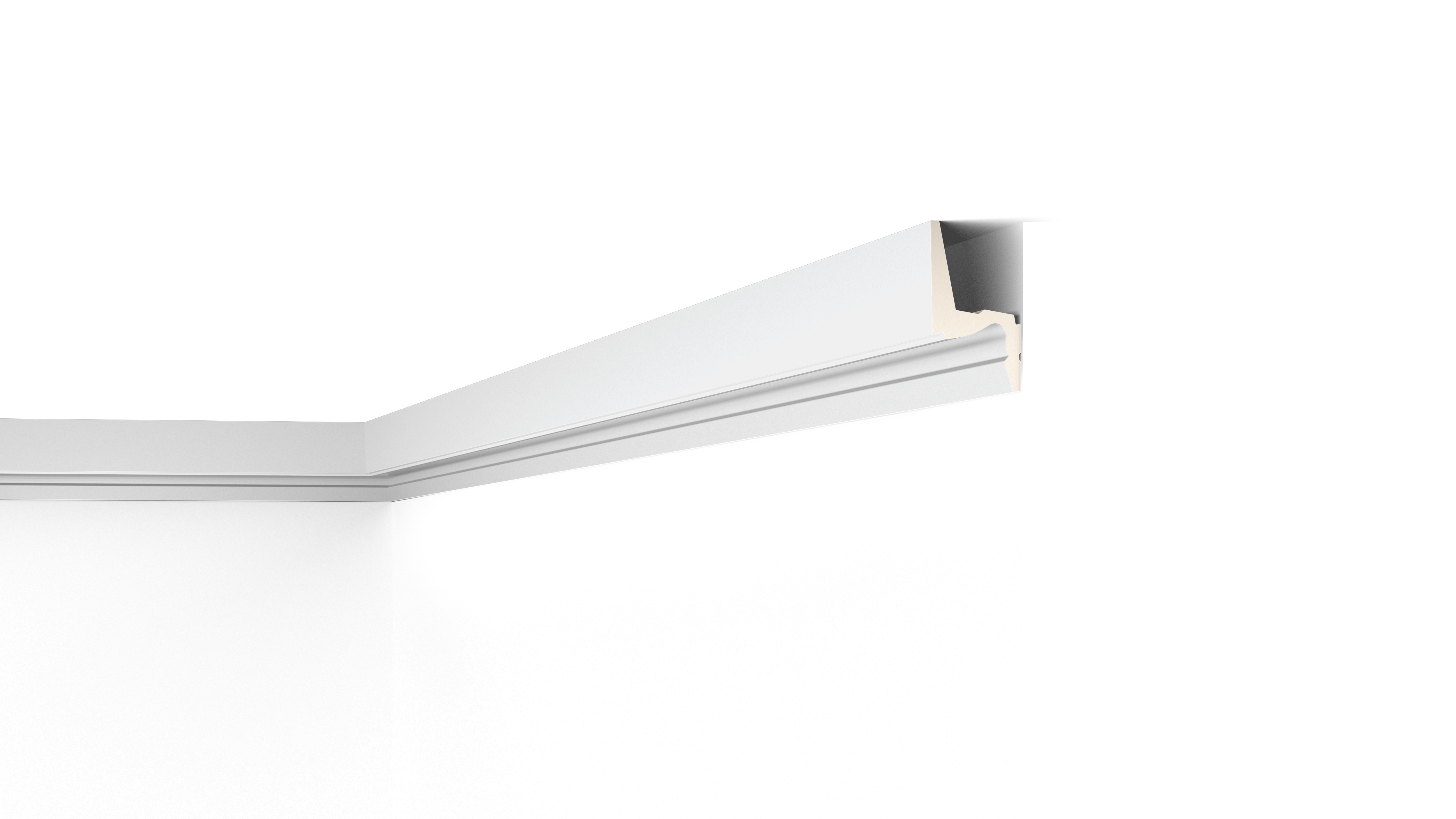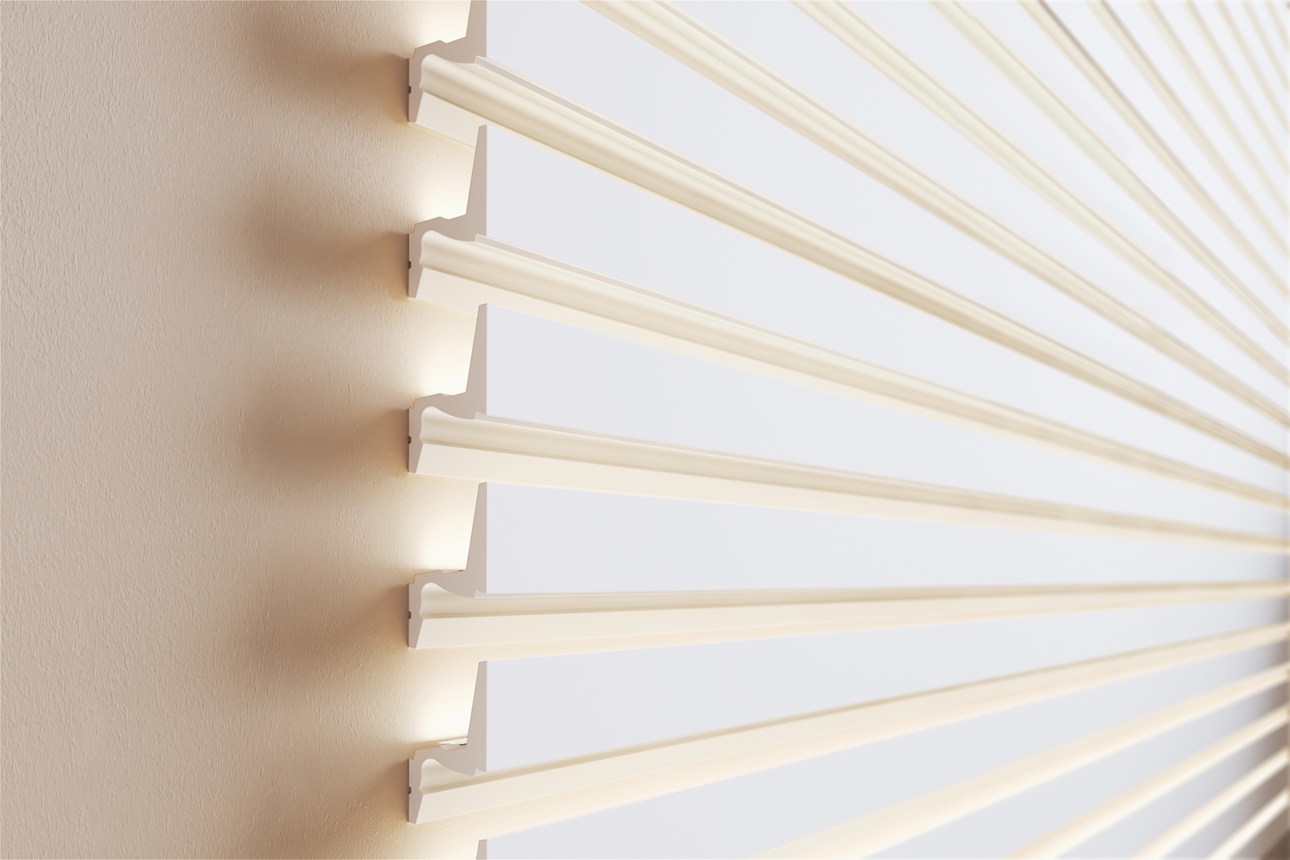 Mit direkter oder indirekter Beleuchtung kombinierbare Decken-, Wand- und Sockelleisten sowie Wanddekoraktionselemente.