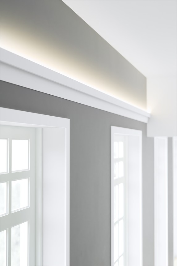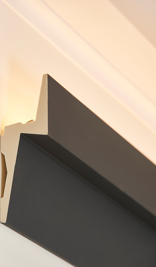 Mit direkter oder indirekter Beleuchtung kombinierbare Decken-, Wand- und Sockelleisten sowie Wanddekoraktionselemente.
