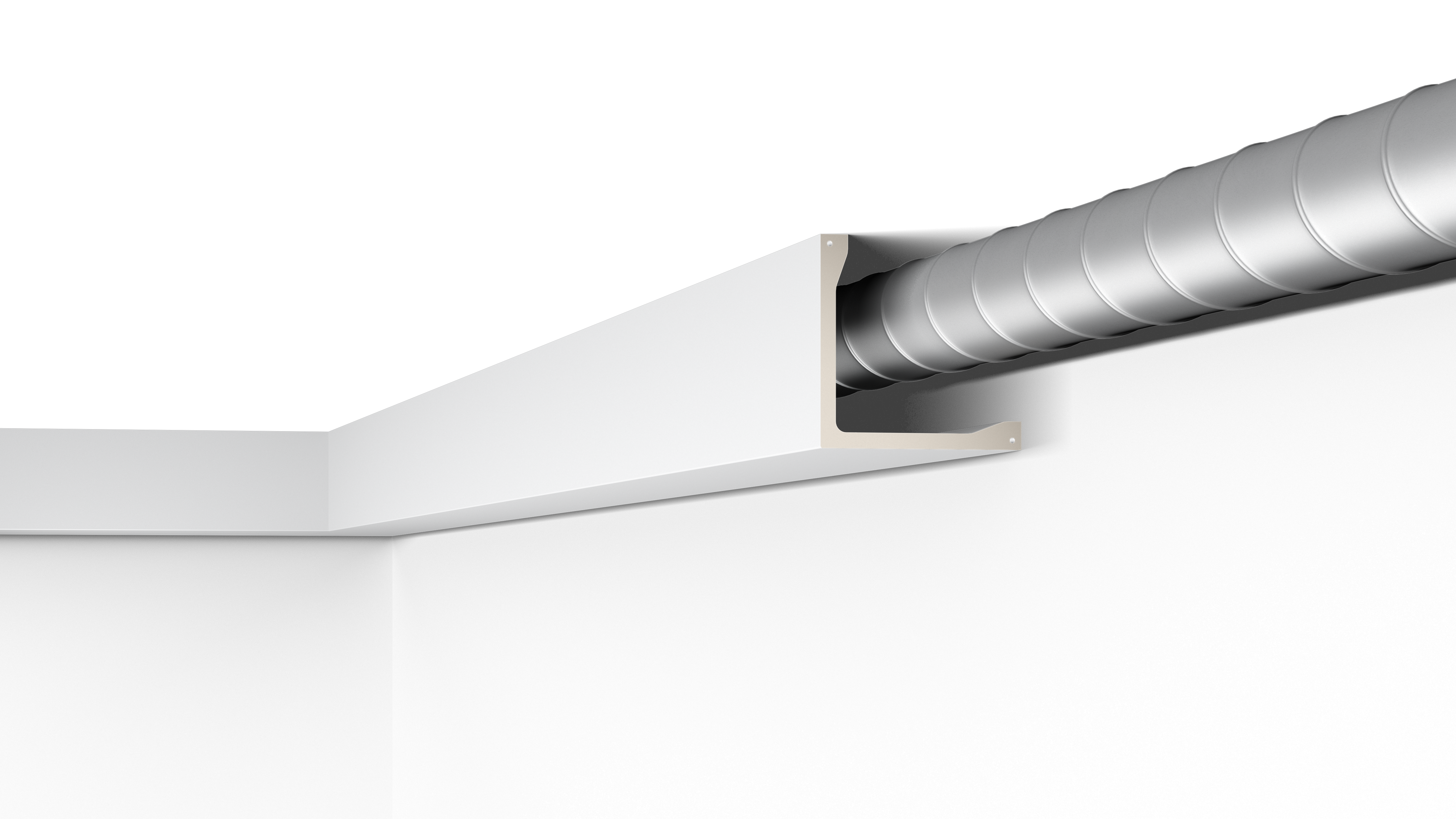 Die Montage der leichten Leiste erfolgt durch einfaches Verkleben. Wir empfehlen die Montage von kleinen Montageklötzen an den eine zusätzliche, mechanische Befestigung vorgenommen werden kann. Die L5 ARSTYL® wird grundiert geliefert und ist bereit für den Anstrich in der endgültigen Farbe. Hinter der L5 ist Platz, um Kabel oder unvollkommene Übergänge zu verdecken.