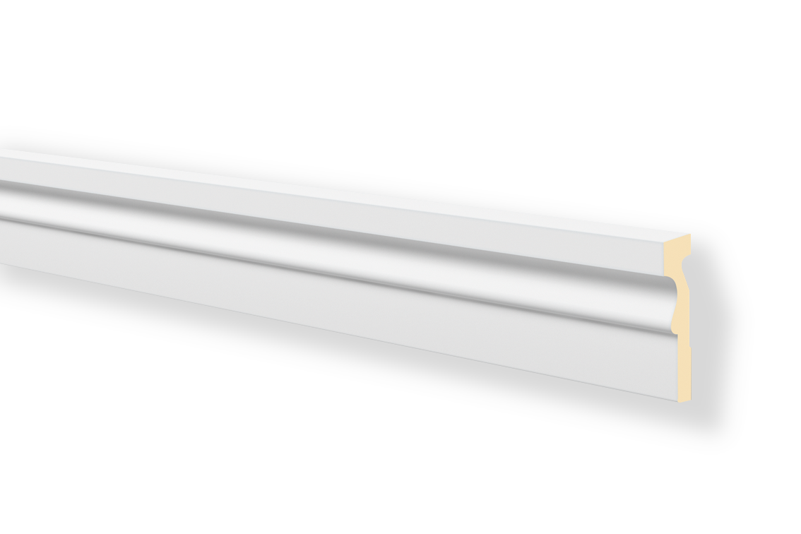 Die Tür- und Fensterrahmenleiste MA12 DOMOSTYL® wird mit einer glatten, weißen Armierungsfolie versehen und ist bereit für den abschließenden Farbanstrich. Die Montage wird durch die raue Klebefläche vereinfacht.