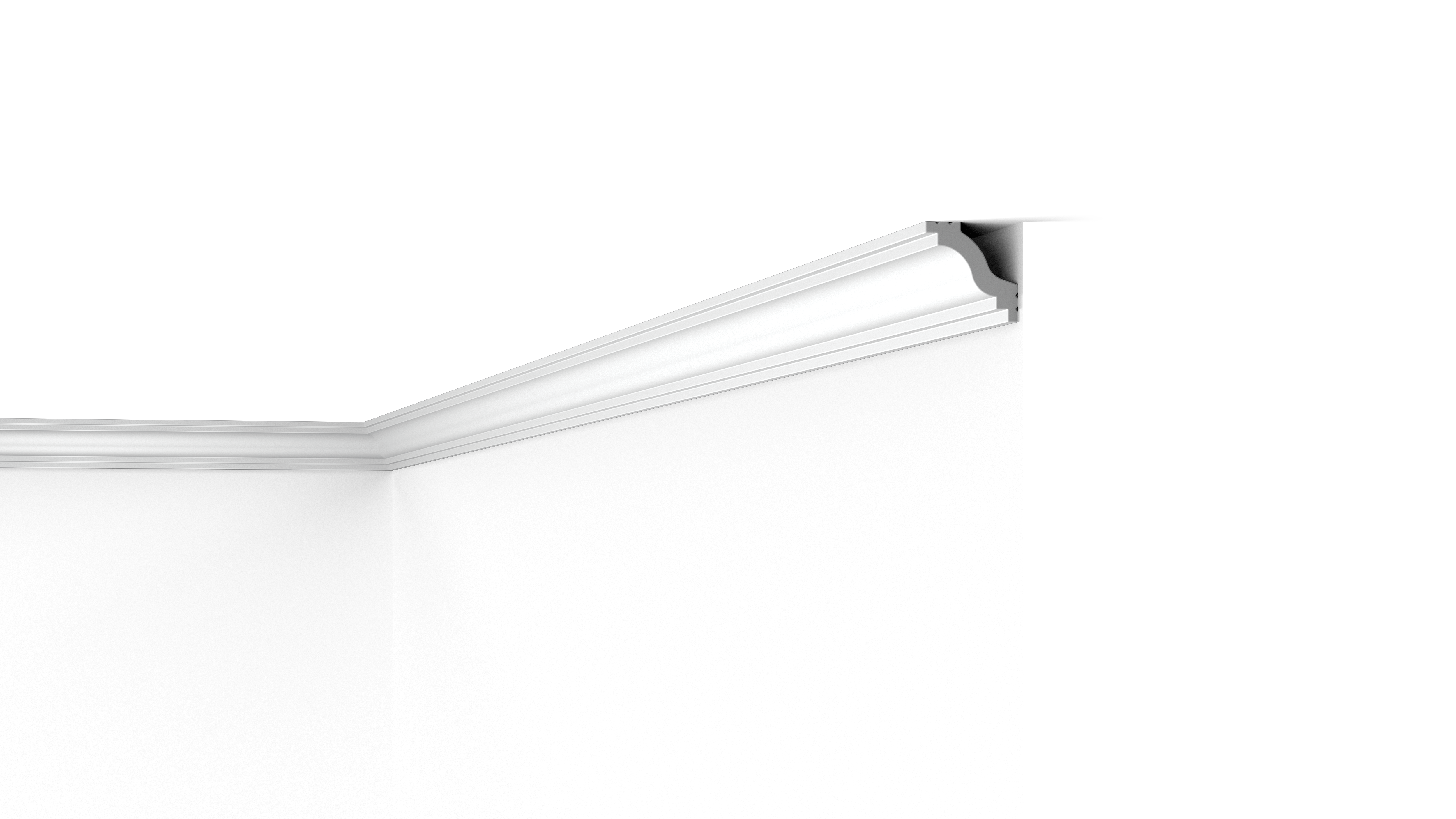 Die WT6 ist grundiert und kann in jeder beliebigen Farbe endbeschichtet werden. Die Deckenleiste bietet Raum, Kabel und unansehnliche Übergänge zu verdecken. Die Installation ist aufgrund des leichten und stoßfesten Materials schnell und effizient.