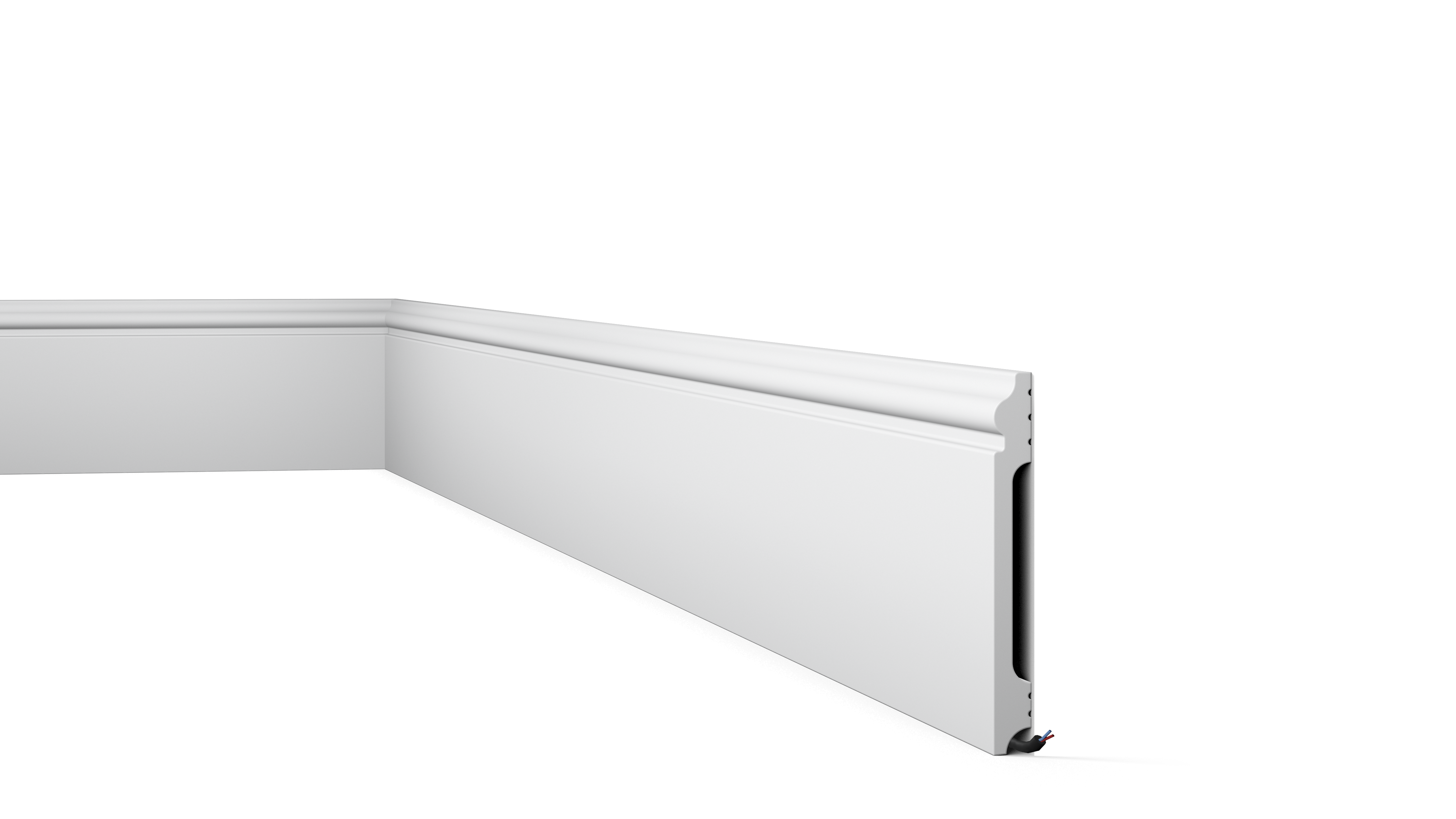 Behind the FL17 is a narrow gap for concealing wiring, cracks and imperfect transitions. The FL17 skirting arrives primed and ready for painting in the final colour. A moisture-resistant material ensures the FL17’s suitability for humid environments, such as bathrooms, spas and kitchens.