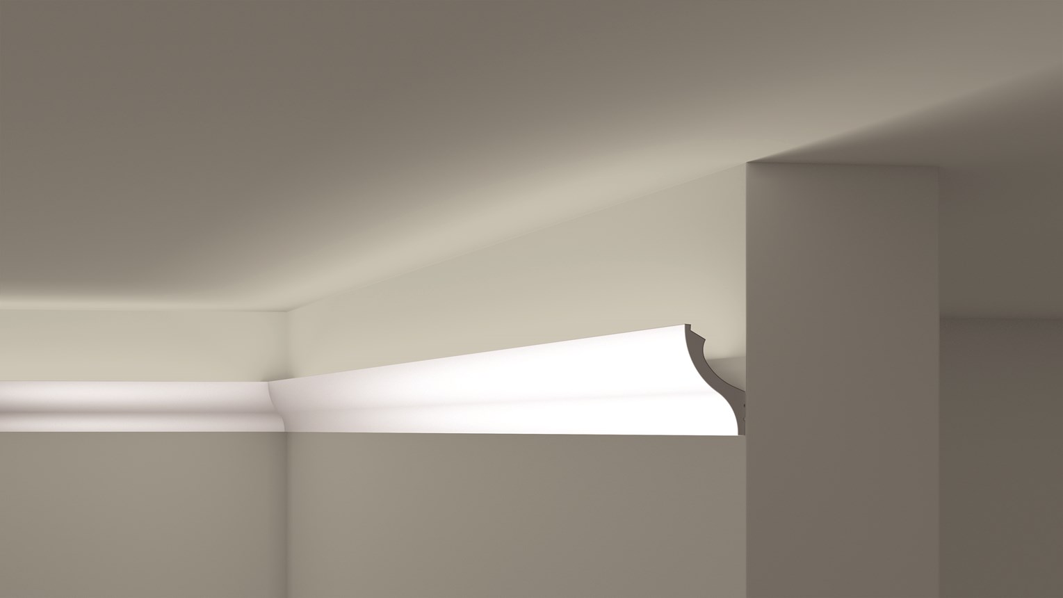 When used with indirect lighting, a space is foreseen at the back of the moulding to fix the LED strips. A grey core makes the IL13 WALLSTYL® opaque, allowing light to be concentrated in one direction. Easy to cut and glue into position, the profile is also primed, ready for the final coat of paint.