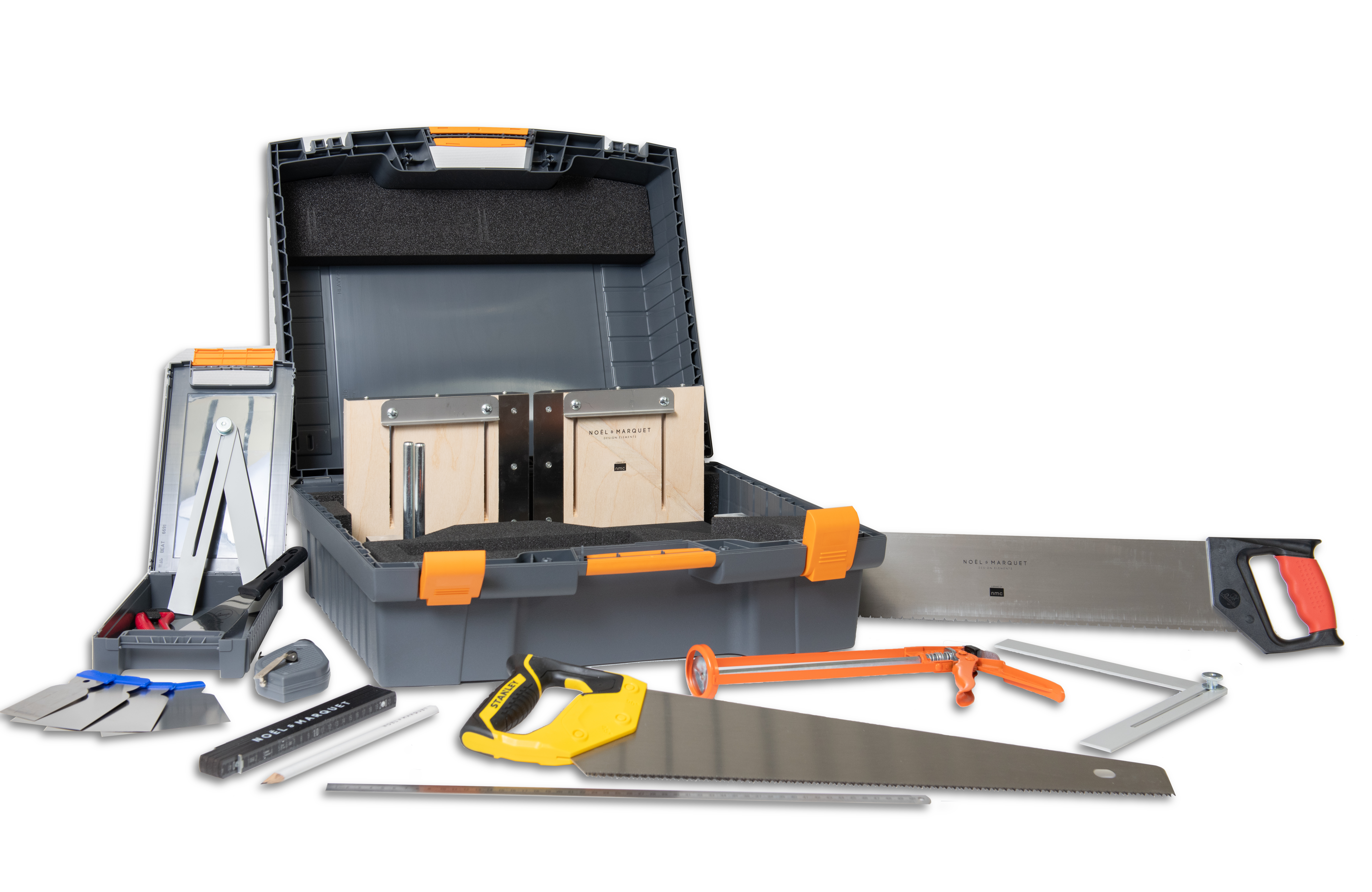 - Content: mitre box, 2 saws (PS saw and HDPS/PU 50cm saw), steel rule, mobile bracket, cartridge gun, cord, cutter, folding ruler, set of ‘Japanese’ spatulas, grouting tool, pencil